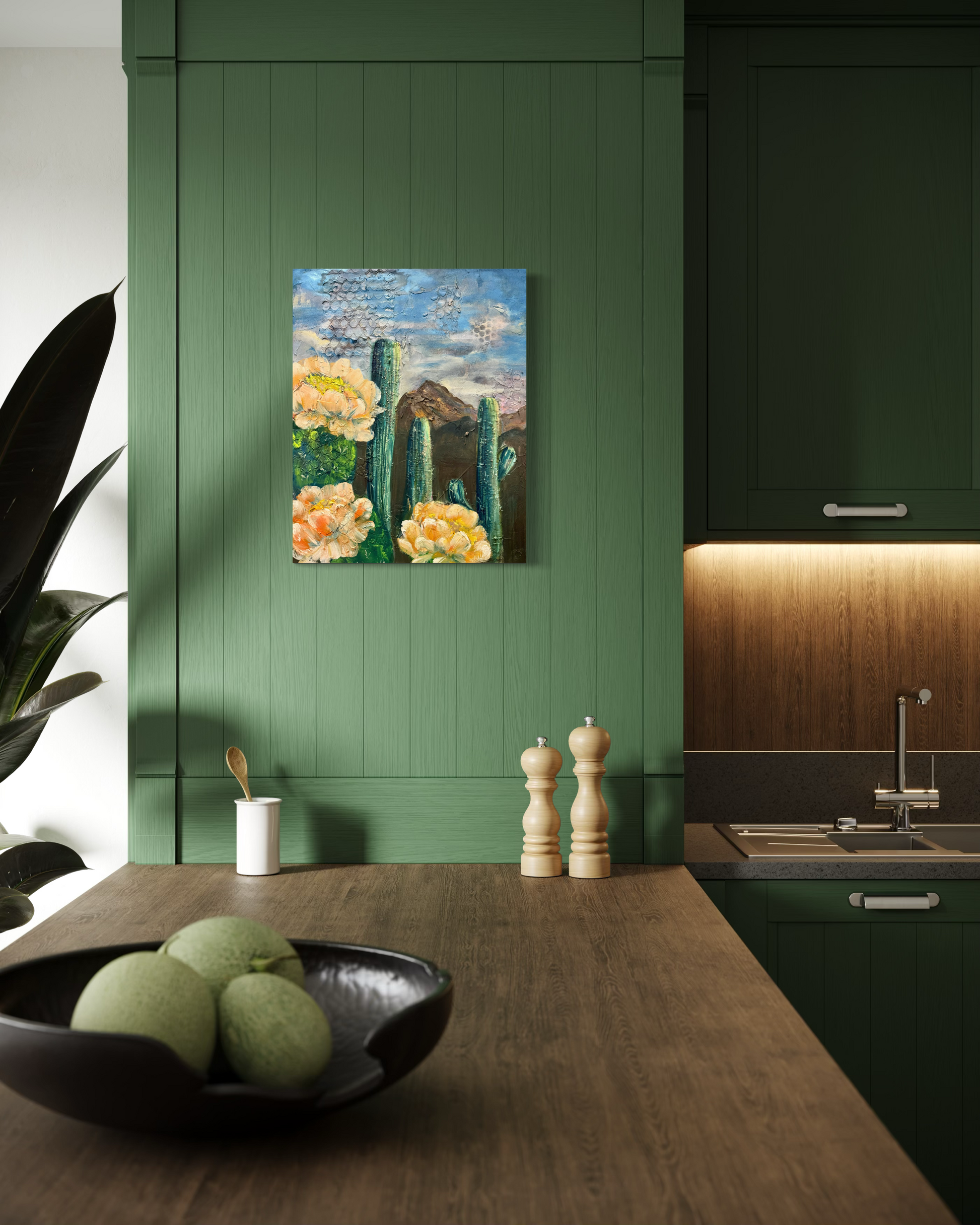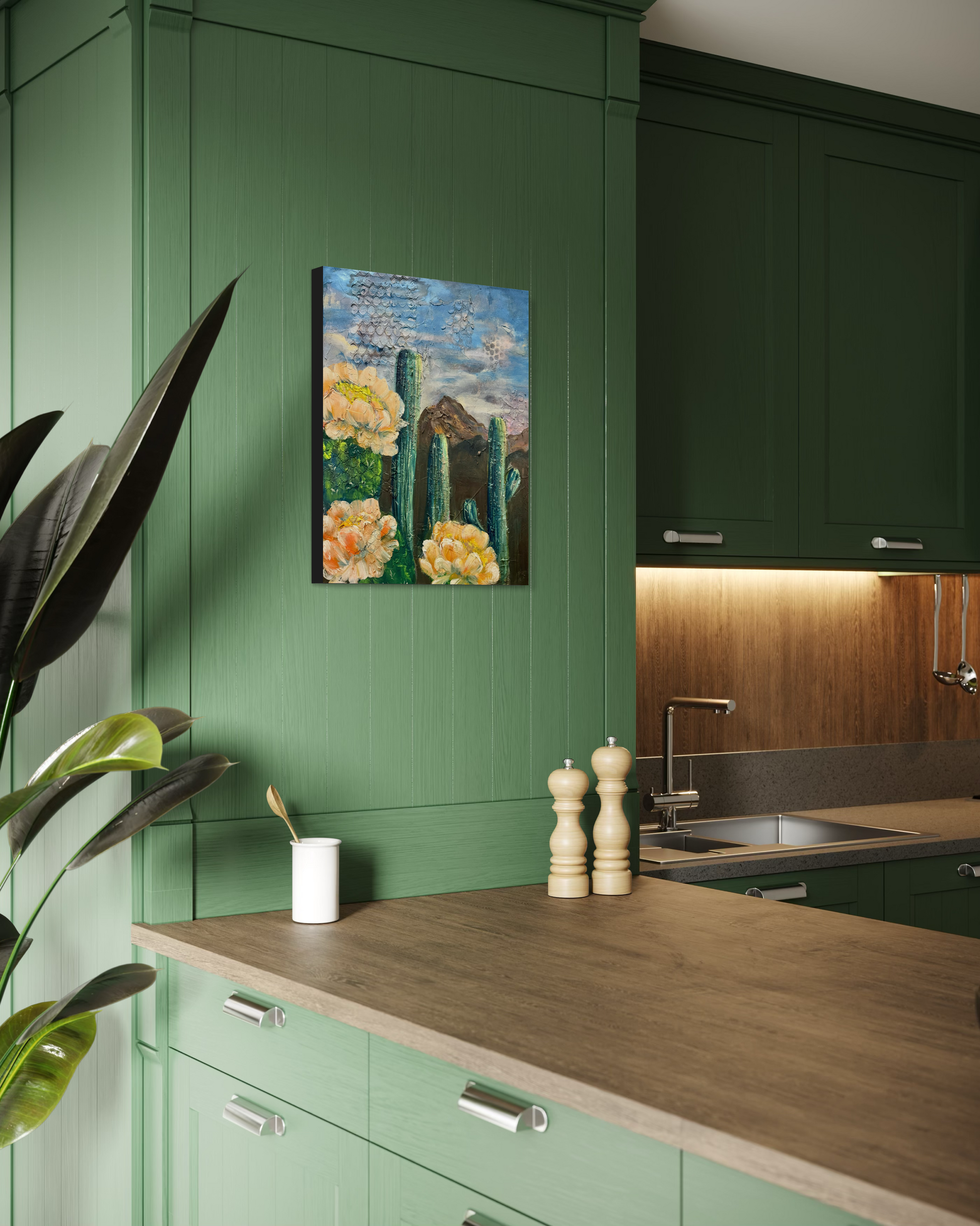 This mixed media landscape layers acrylic washes, textured detail, and soft floral touches to capture the vastness of the desert sky. Desert Horizon points to the Creator who paints beauty across every horizon.