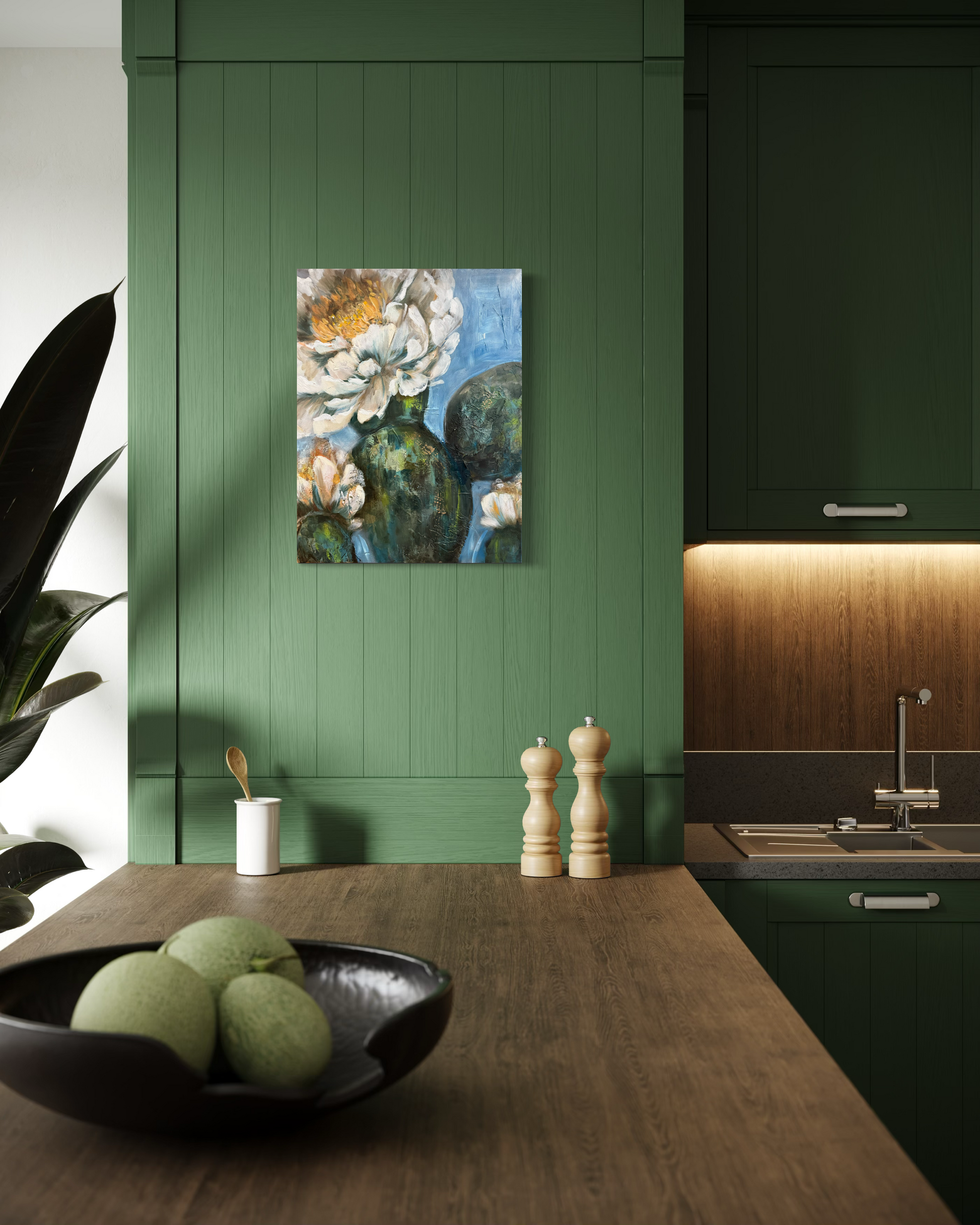 Created with bold textured strokes and layered whites against desert greens, Desert Radiance celebrates beauty emerging from hardship. Like blossoms among thorns, it testifies to God’s sustaining grace.